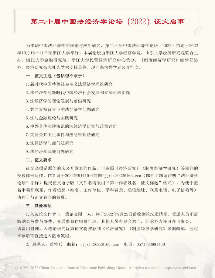 第二十届中国法经济学论坛(2022)征文启事