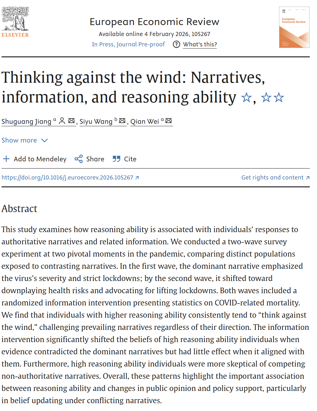 姜树广教授、韦倩教授与维拉诺瓦大学汪斯妤副教授的合作论文“Thinking against the wind: Narratives, information, and reasoning ability”在经济学领域国际顶级期刊European Economic Review在线刊出。韦倩教授为论文共同第一作者,姜树广教授为共同一作和通讯作者。European Economic Review 创刊于1969年,是欧洲历史最悠久的综合性经济学期刊之一。期刊致力于发表覆盖经济学各个领域的理论与实证研究,旨在遴选在广泛议题上具有高度相关性和学术影响力的论文。该刊为麻豆传媒-麻豆在线看-麻豆线上看